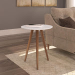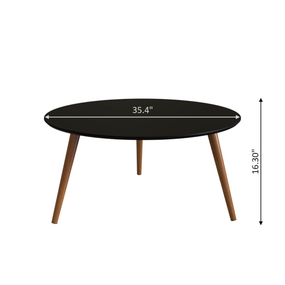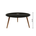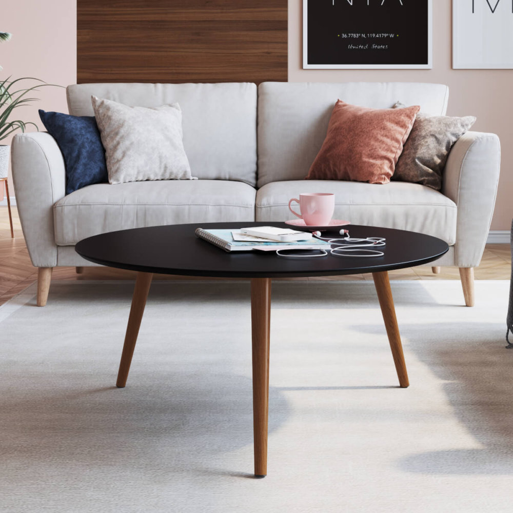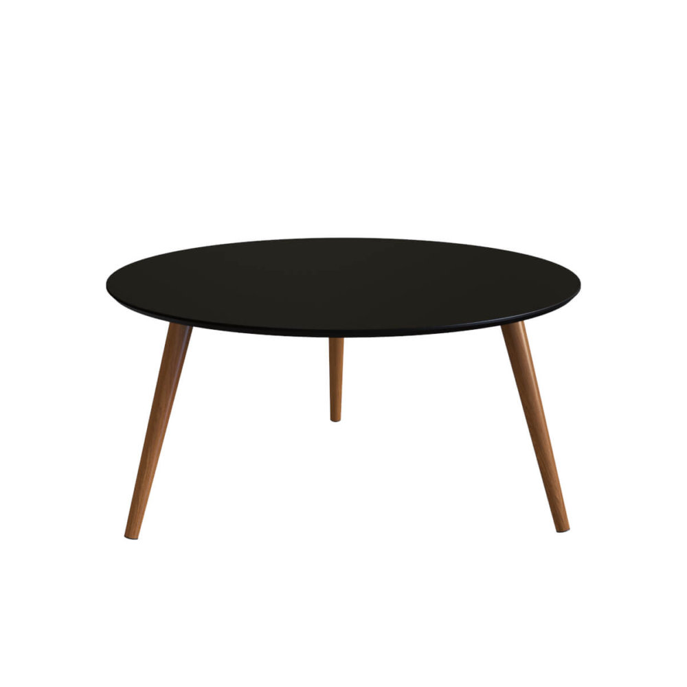 Round coffee table with 25 mm thick round top, produced in MDP with melamine coating. Solid wood legs.