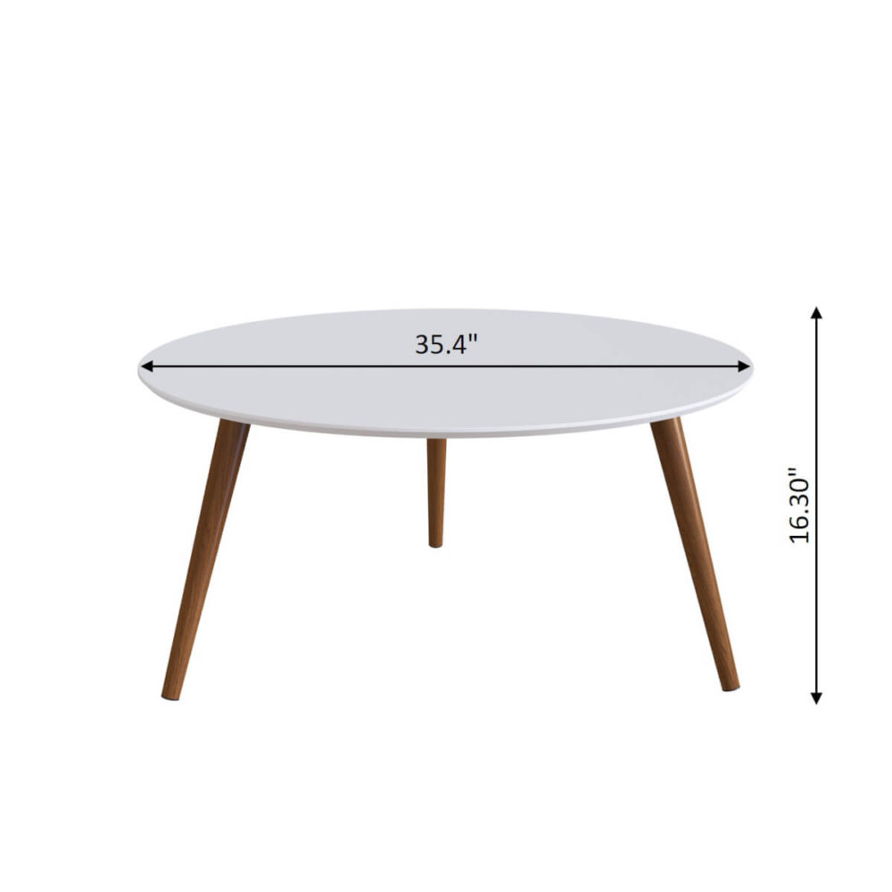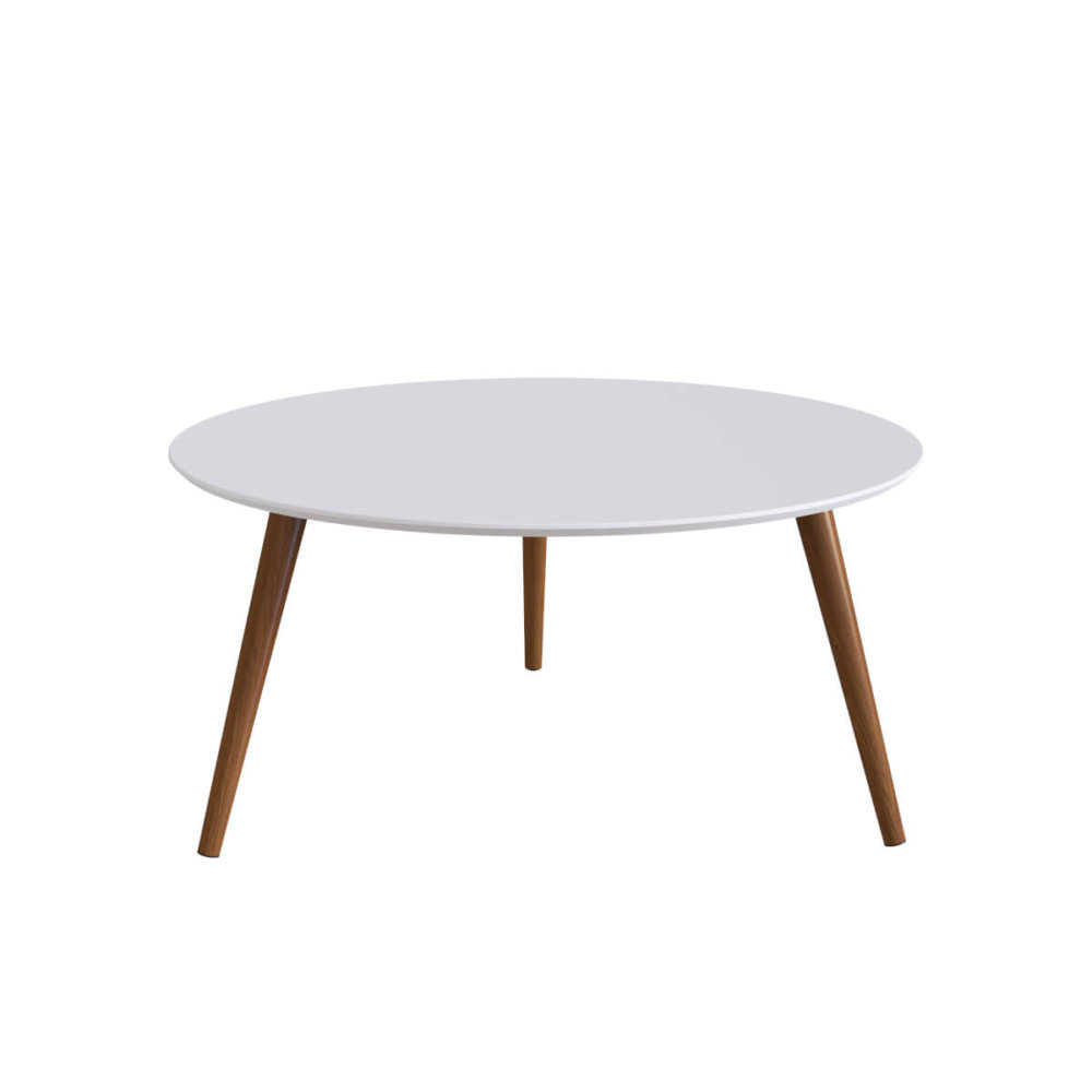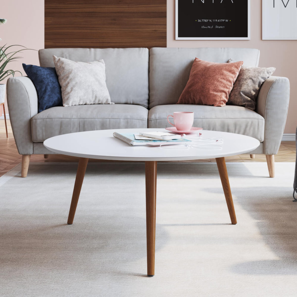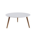 Round coffee table with 25 mm thick round top, produced in MDP with melamine coating. Solid wood legs.