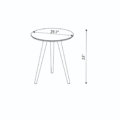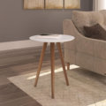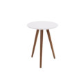 Round side table with 25 mm thick round top, produced in MDP with melamine coating. Solid wood legs.
