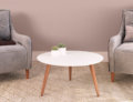 Round coffee table with 25 mm thick round top, produced in MDP with melamine coating. Solid wood legs.