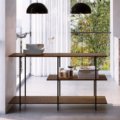 Industrial style console, with 15mm thick MDP shelves. Rustic style wood. Metallic structure made of round steel tube with 15mm diameter, coated in epoxy paint. The legs have a plastic protection pad.