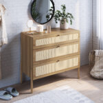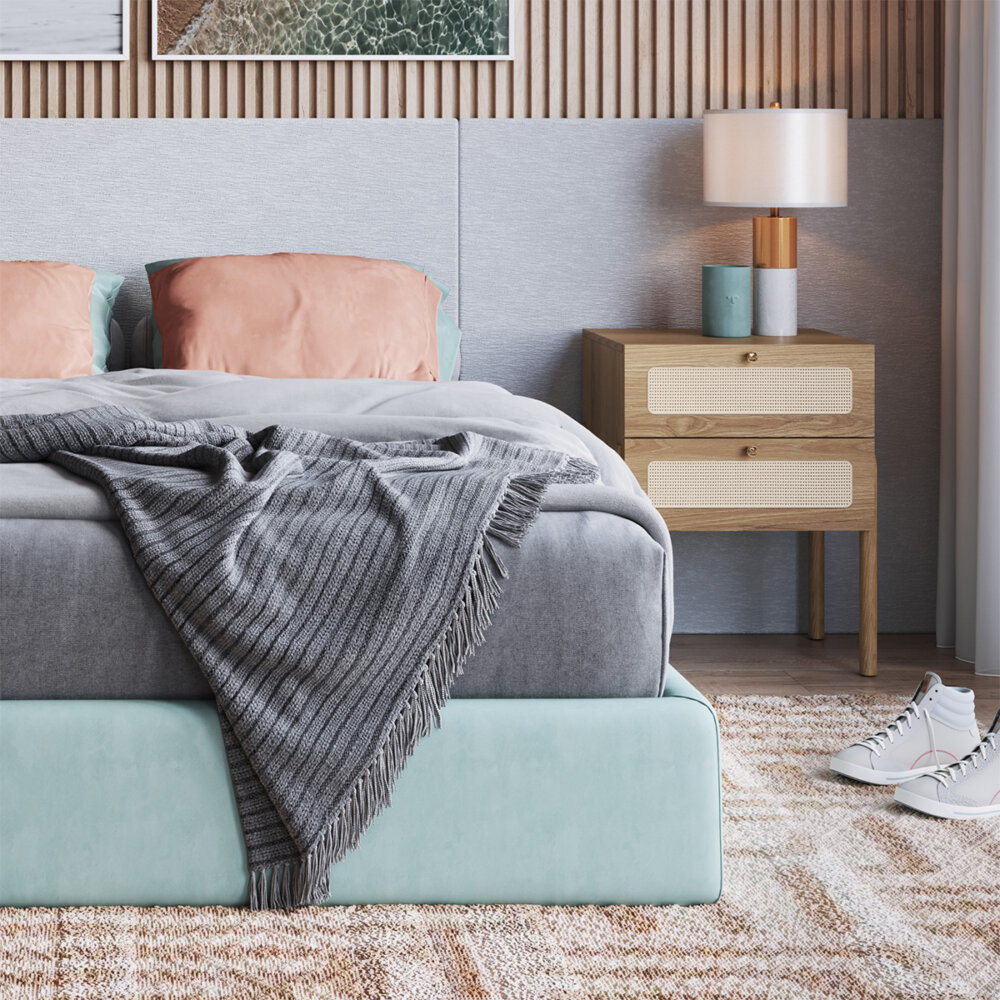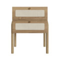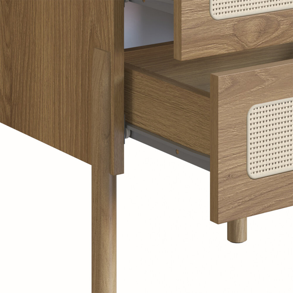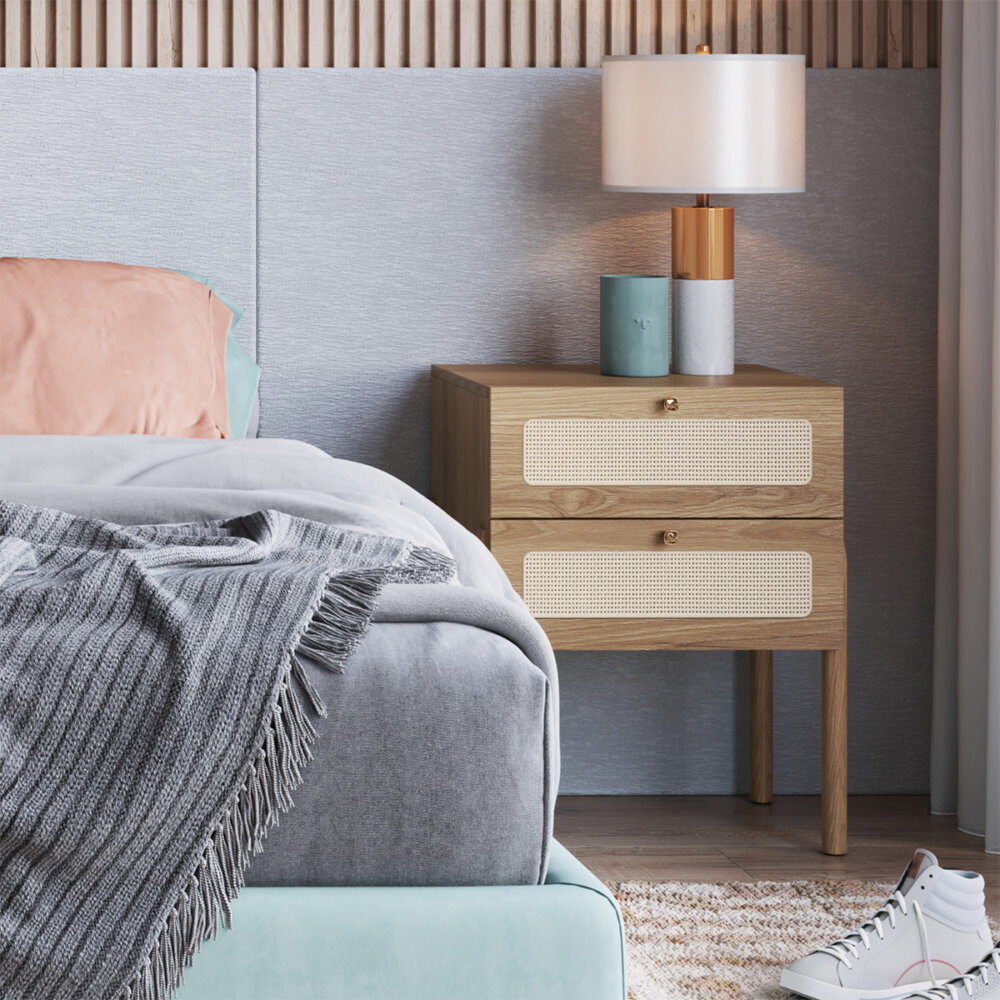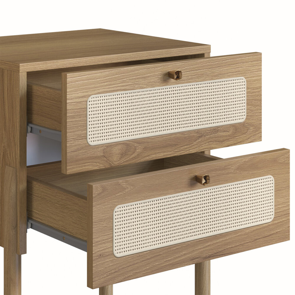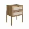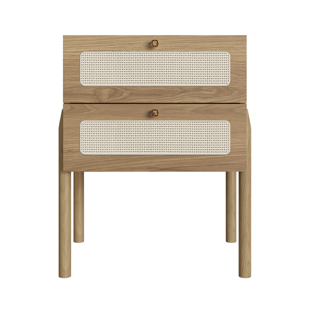 This 2-drawer nightstand streamlines your space with a natural appearance and great practicality. Crafted from solid and manufactured wood, it will add a hint of contemporary aesthetic to your bedroom. The synthetic rattan details, in addition to giving it an organic touch, are highly resistant and will withstand the passage of time, aging beautifully and developing its unique character. The natural and organic palette blends in seamlessly with any color scheme or style, becoming a perfect addition to your house.