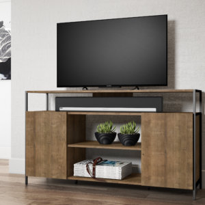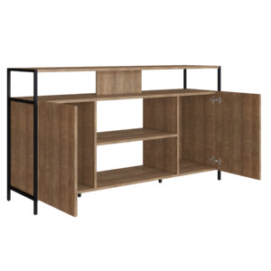 $218.99Embolden the character of you living room or bed room with this awesome TV stand. Crafted from manufactured wood, this striking piece is constructed from sturdy wood and metal accents. The 2 open shelves are a convenient display for media devices or décor, while 2 additional shelves behind the doors offer storage space for everything you don't wan't in sight. The metal accents lend a cool, industrial feel to your home, without sacrificing functionality. -